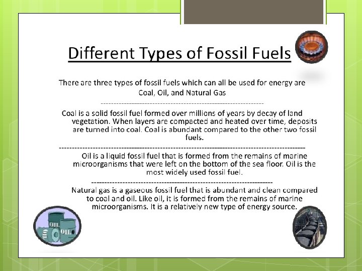 Fossil fuel = a natural fuel containing carbon, made in ancient times when the remains of living organisms were compressed & heated. Fossil fuels are a non-renewable resource, as humans can’t make or replenish them.