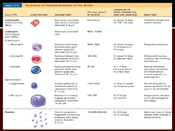 Differential WBC count (All total 4800 – 10, 800/l) Formed elements Platelets Leukocytes Granulocytes Neutrophils (50 – 70%) Eosinophils (2 – 4%) Basophils (0. 5 – 1%) Erythrocytes Agranulocytes Lymphocytes (25 – 45%) Monocytes (3 – 8%)