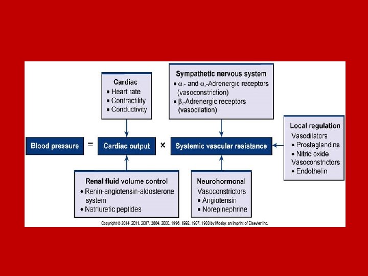 Normal Regulation of BP • BP is the force exerted by the blood against the walls of the blood vessel – must be adequate to maintain perfusion • CO = SV x HR • Mechanisms that regulate BP affect either CO or SVR (systemic vascular resistance) • Short and long term mechanisms to regulate BP