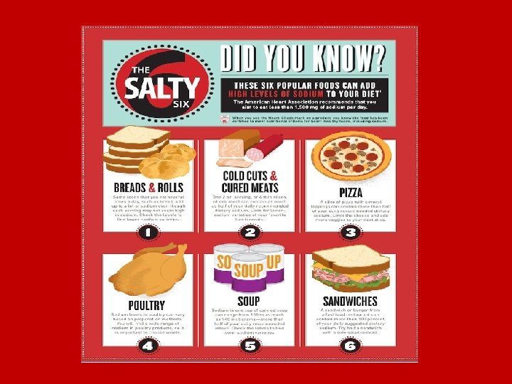 Dietary Sodium Reduction • Teach patients to Read labels of over the counter drugs, packaged foods, and health products to look for hidden Na • What are some foods high in Na? – Processed foods, canned products, chips, crackers, luncheon meats, cheese, soda, restaurant food, ketchup, table added salt