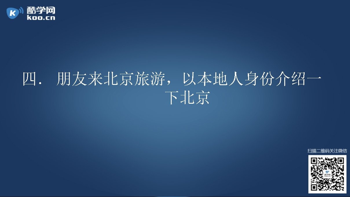 中间段: 介绍玩的地方——体现方位 The xxx is located in western city, 10 kilometers from the central city. It’s the most leading and classical building which enjoys a worldwide reputation. The building lies/is situated in the center of the campus. If you want to reach there from the south gate, you could go down the path through a garden. Walk about 50 meters, then turn left and you can see the new building that faces the exit of the garden.