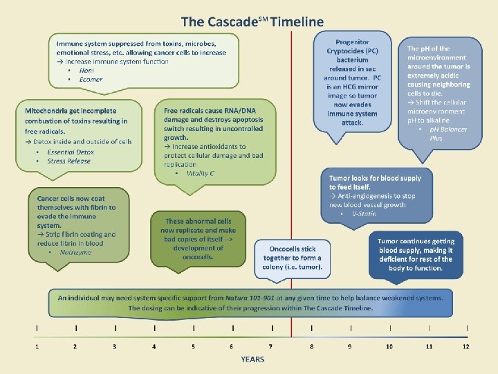The Cascade �Cancer is not a “spontaneous eruption” in the body. Nothing in nature is spontaneous. �When you understand how a cancer forms, and how cancer establishes a happy home in a body, Then you can develop preventative strategies to manage and control the imbalances that occur in the beginning of the Timeline as well as therapeutic protocols for “known” cancers.
