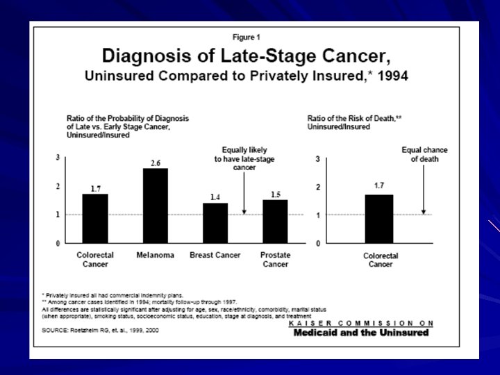The uninsured receive poor medical care Inability to fill prescription Lack of regular healthcare provider or institution Poor care of chronic disease The “unhappy triad” of uninsurance – Receive less preventive care – Diagnosed at more advanced disease stages – Once diagnosed, receive less therapeutic care
