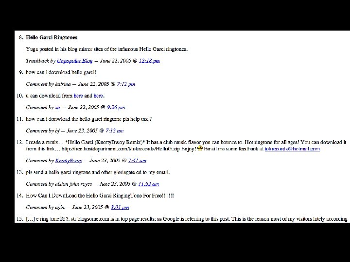 HELLO GARCI Manila Standard , June 16, 2005 “The explosive exchange that critics of the administration say is between the President and the Comelec official is the hottest commodity among infotech freaks, who have parlayed the illegally extracted phone conversation into ring tones and pirated CD reproductions that sell for P 5 on the sidewalks. ”