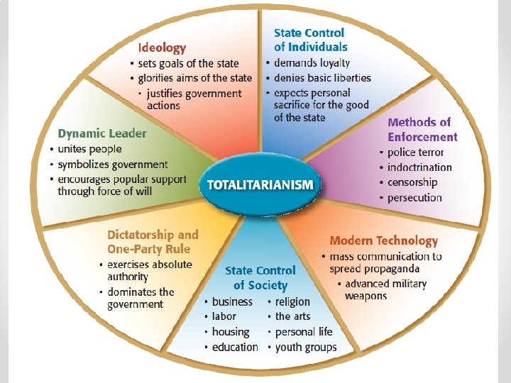 Totalitarianism • Totalitarianism: A form of government where the government holds total control over every aspect of society o o o Specific set of beliefs A single political party led by a dictator (ruler with complete control) System of terror that uses violence and secret police Monopoly on weapons Government control of the economy • Cause: With most countries in the world in debt due to World War I, many European countries turned to new leaders