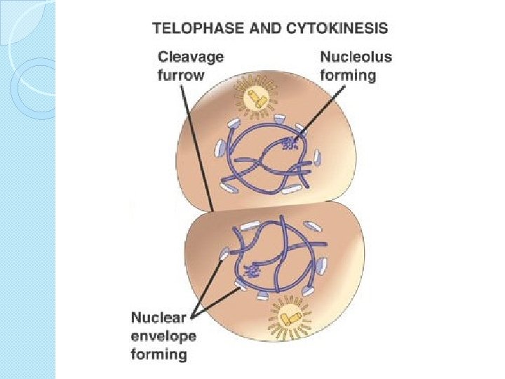 5. Telophase �Complete set of chromosomes at each end of cell �Spindle fibres begin to disappear �Nuclear membrane reforms around each set of chromosomes �Nucleolus appears in each nucleus Now that there are 2 nuclei in the cell, the cell can divide!