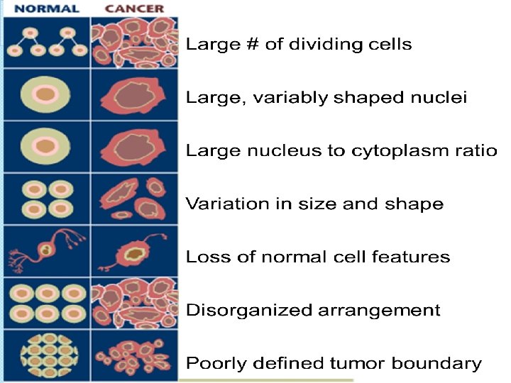 �Healthy/normal cells grow in a single layer and stop when told by neighbour cells �Cancer cells do NOT stop ◦ Form multiple layers tumours �Cancer cells have large, abnormal nuclei ◦ Checkpoints aren’t working, causing chromosomes to divide incorrectly