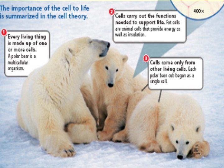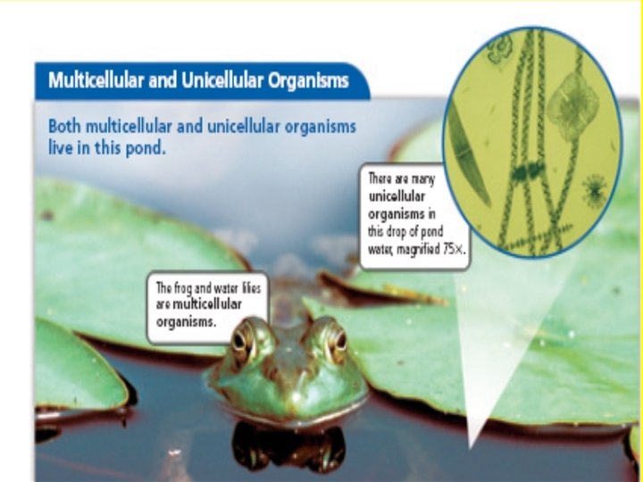All living things are made of cells (continued) multicellular organisms – organisms made of many cells • much more complex than unicellular organisms • different cells perform different functions • many cells work together to carry out the activities of life example: frog, bird, lily pad, grass, etc.