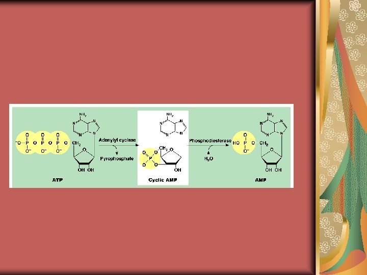 Fig. 11 -15 Reception Binding of epinephrine to G protein-coupled receptor (1 molecule) Transduction Inactive G protein Active G protein (102 molecules) Inactive adenylyl cyclase Active adenylyl cyclase (102) ATP Cyclic AMP (104) Inactive protein kinase A Active protein kinase A (104) Inactive phosphorylase kinase Active phosphorylase kinase (105) Inactive glycogen phosphorylase Active glycogen phosphorylase (106) Response Glycogen Glucose-1 -phosphate (108 molecules)