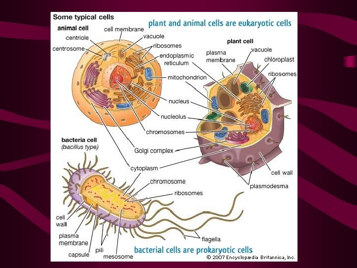 Two Types of Cells • Prokaryotic • Contain no nucleus. • Have no membrane covered organelles, but do have ribosomes to make protein. • Possess circular DNA. • Are bacteria.