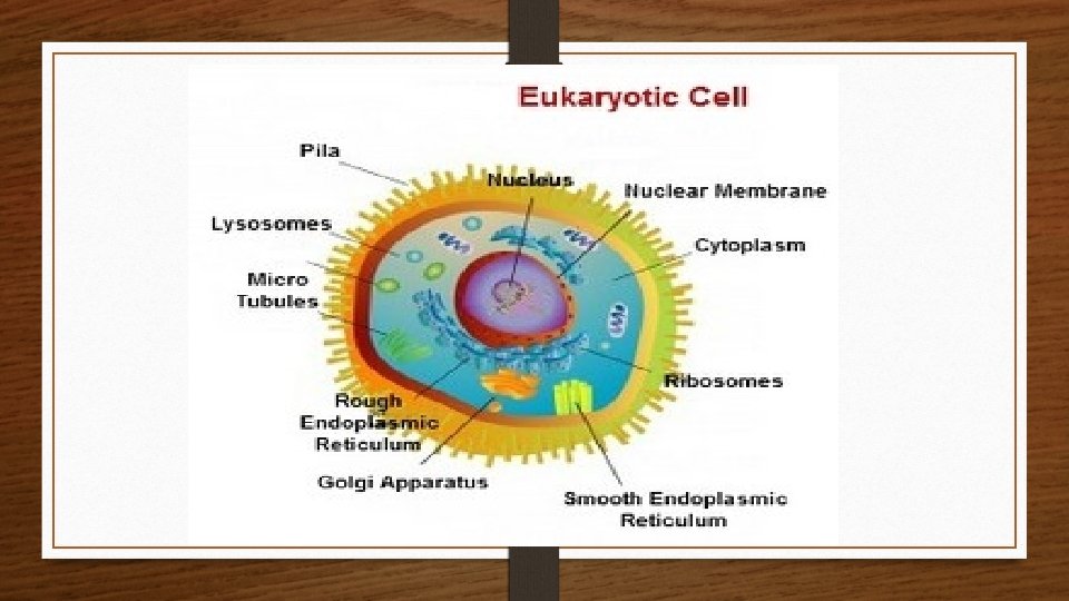 Eukaryotic cells generally consist of: • • • cell wall plasma membrane nucleus, mitochondria, chloroplasts (plastids), endoplasmic reticulum, ribosome, • • • Golgi apparatus, lysosomes, vacuoles, cytoplasm and chromosomes