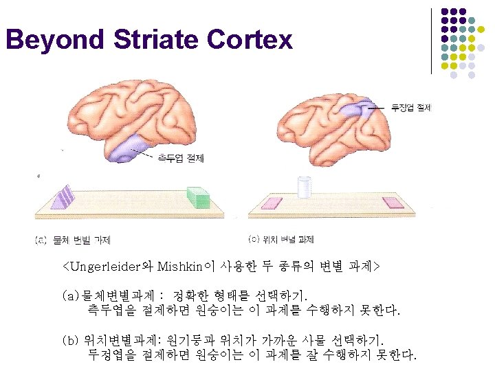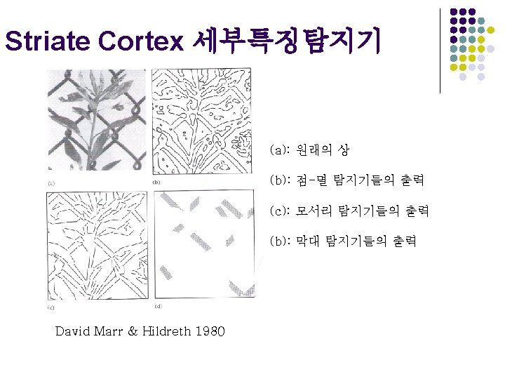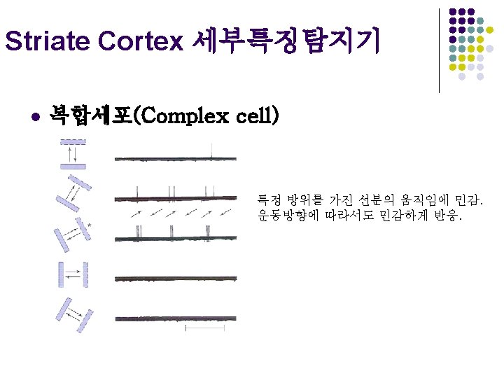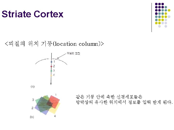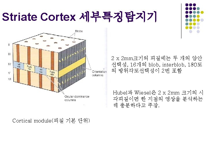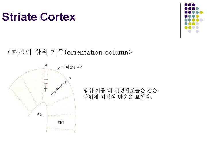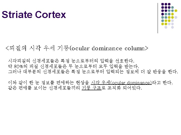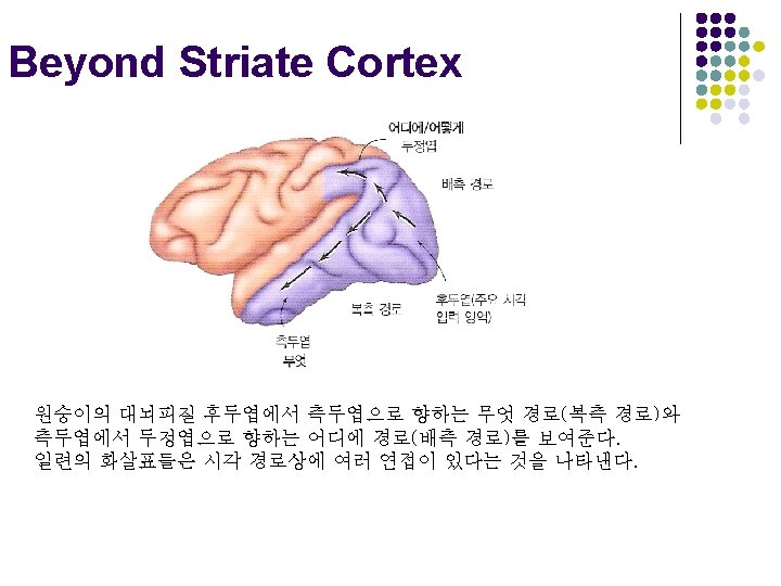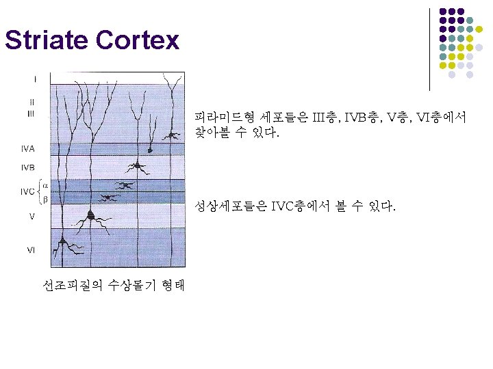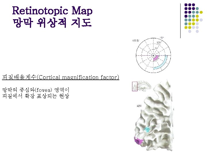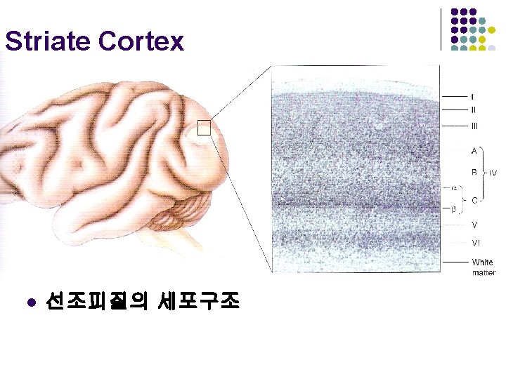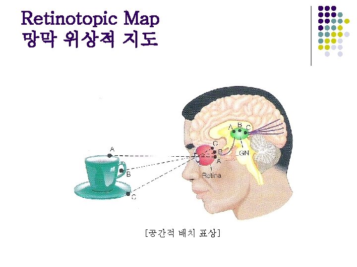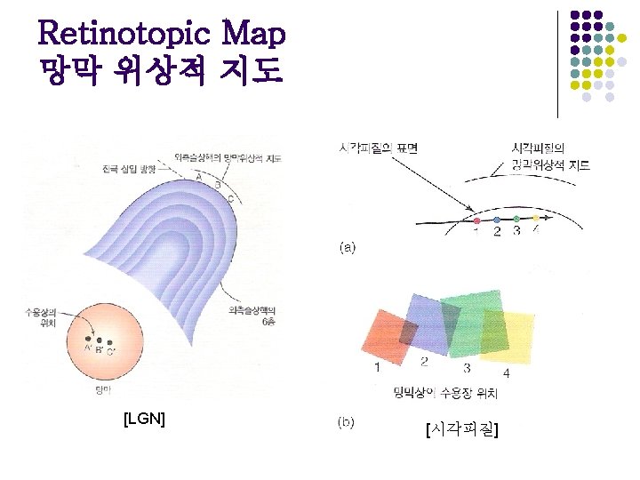목차 l l l Retinofugal projection(망막으로부터의 투사) Lateral Geniculate Nucleus(LGN, 외측슬상핵 ) Striate Cortex(선조피질) Beyond Striate Cortex From Single Neurons to Perception