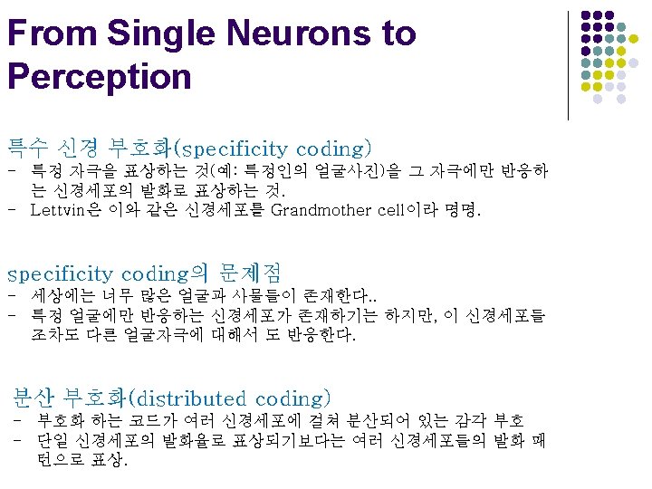 From Single Neurons to Perception 할머니세포(Grandmother cell)은 존재하는가?