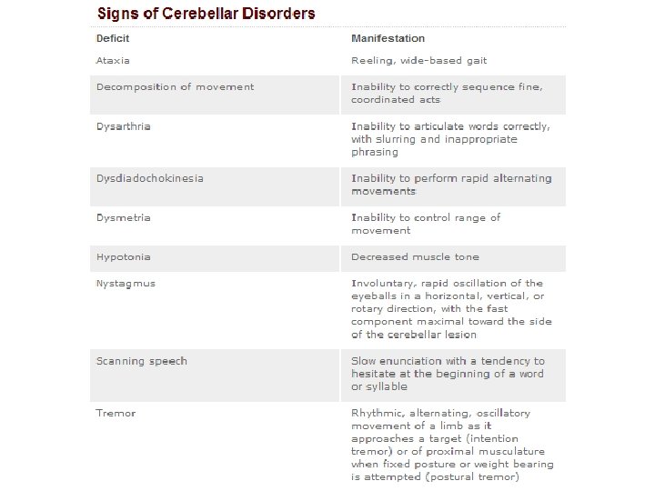 Ataxia n Defective timing of sequential contraction of agonist /antagonist muscles n Results in a disturbance in smooth performance of voluntary acts (errors in rate, range, force, duration) n Without cerebellar modulation, skilled movements originating in cerebral cortex are inaccurate, poorly controlled n May affect limbs, trunk, gait (depends on part of cerebellum involved) n usually persists despite visual cues (unlike ataxia due to posterior column disease affecting the spinal cord)