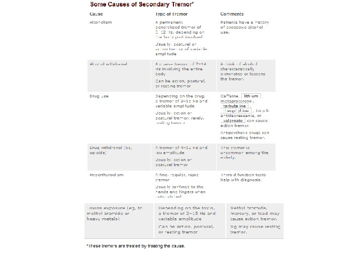 Tremor- Cerebellar Disease n an intention tremor; no effective drug available; physical measures (eg, weighting the affected limbs or teaching patients to brace the proximal limb during activity) sometimes helps n Asterixis: not a tremor; muscle tone lapses when wrist extension is attempted, resulting in repetitive, nonrhythmic, non-oscillatory wrist flexion; a sign of chronic renal or liver failure (differentiate from tremor) n n 3 -5 Hz Usually bilateral Can be a sign of hepatic encephalopathy (inability of liver to metabolize ammonia to urea) Patient is usually drowsy or stuporous