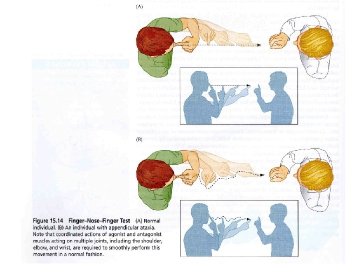n Asynergia= lack of synergy of various muscles while performing complex movements ( movements are broken up into isolated, successive parts-- decomposition of movement) n n Dysmetria= abnormal excursions in movement Dysdiadochokinesia= impaired performance of rapidly alternating movement Past-pointing n Excessive rebound when an opposed motion is suddenly released n