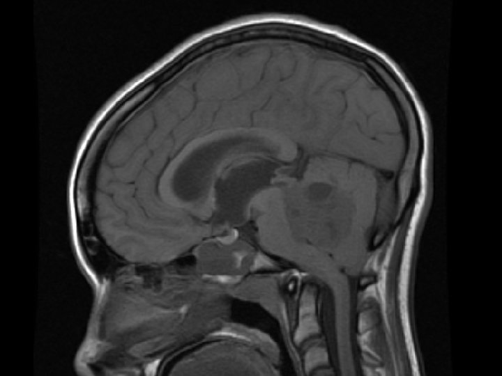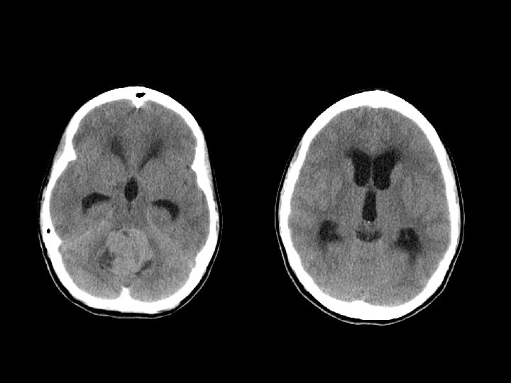 n n n n n HR 76, RR 16, BP 135/76 mm. Hg, T-35. 9 Awake, alert, oriented x 3, speech OK Pupils 4 mm bilat. , brisk, full EOM Nystagmus up & lateral gaze Bilateral papilledema Symetrical facial features N bulk & tone, full power arms & legs 5/5 Reflexes symmetric, Plantars equivocal Difficulty pointing bilat. , dysmetric, past pointing, heel to shin good Broad based gait