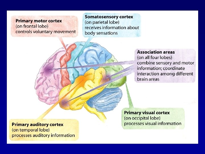 Association Areas of the Cortex • More intelligent animals have increased "uncommitted" or association areas of the cortex. • These areas used for integrating and acting on information received and processed by sensory areas. • Allows for learning, thinking, memory & adaptability