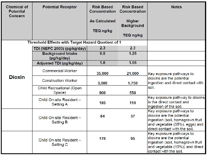 Initial Site Risk Based Soil Concentrations 2001 WHO 98 TDI (pg/kg/day) 1 2 4 Commercial Worker 20 000 40 000 80 000 Construction Worker 1 625 3 250 7 500 Child Recreational 370 740 1 480 Child Residential 38 76 152 RBSC TEQ ng/kg: NHMRC 70 pg/kg/month or 2. 3 pg/kg/day TEQ as TDI Child Res = 100 ng/kg