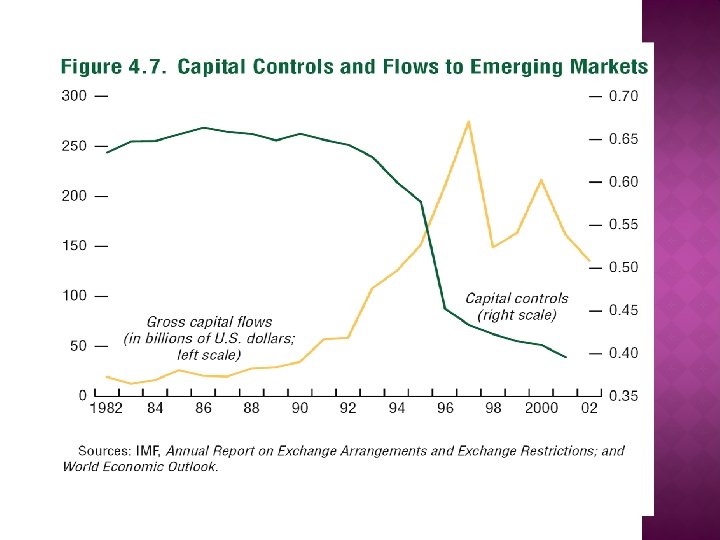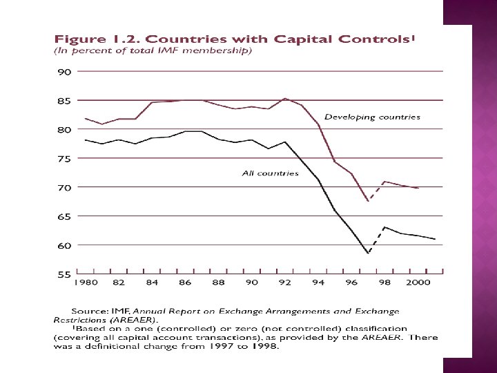 IMF ANNUAL REPORT ON EXCHANGE ARRANGEMENTS AND EXCHANGE RESTRICTIONS � IMF (which has jurisdiction over current account, not capital account, restrictions) maintains detailed compilation of member countries’ capital account restrictions � The information in the AREAER has been used to construct measures of financial openness based on a 1 (controlled) to 0 (liberalized) classification � They show a trend toward greater financial openness during the 1990 s � But these measures provide only rough indications because they do not measure the intensity or effectiveness of capital controls (de jure versus de facto measures)