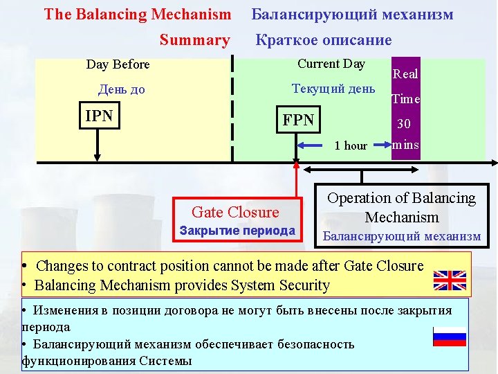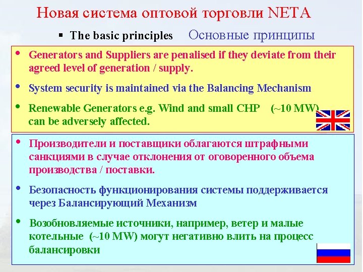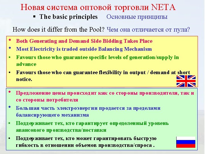 The New Electricity Trading Arrangements Новая система оптовой торговли НЕТА The Balancing Mechanism • • Балансирующий механизм To allow system to remain stable Too little electricity on the system – Generators can OFFER to INCREASE output – Suppliers can OFFER to REDUCE consumption Time OFFER FPN Time • If OFFER is agreed then Generators / Suppliers are PAID for any electricity increased / reduced under the OFFER.