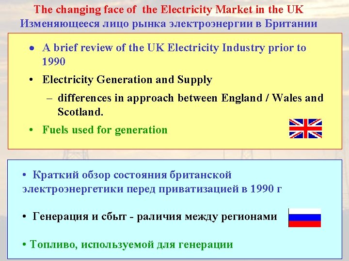 The changing face of the Electricity Market in the UK Изменяющееся лицо рынка электроэнергии в Британии • • A brief review of the UK Electricity Industry prior to 1990. The Electricity Markets in the 1990 s after Privatisation The New Electricity Trading Arrangements NETA (2001) The British Electricity Trading and Transmission Arrangements (BETTA). • The Supply of Electricity since 1990 • Conclusions • Краткий обзор состояния британской электроэнергетики перед приватизацией в 1990 г • Рынки электроэнергии в 1990 г после приватизации • Новая система оптовой торговли NЕТА (2001) • Порядок передачи и торговли электроэнергией в Великобритании (BETTA) • Сбыт электроэнергии с 1990 • Заключение