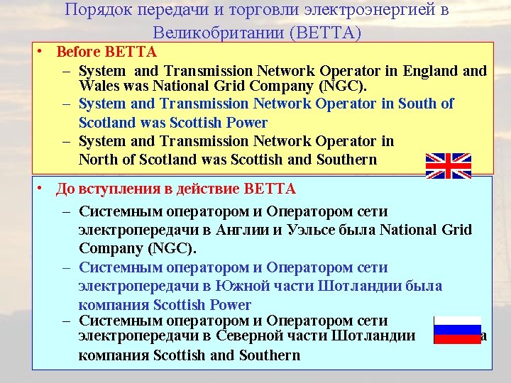 Developments in the Electricity Markets in the UK: the move towards BETTA Развитие рынка электроэнергии в Великобритании: на пути к ВЕТТА This presentation is available over Internet at • www 2. env. uea. ac. uk/gmmc/neta/NETA. htm • Further information on the POOL and NETA – The Changing Face of the Electricity markets in the UK [2003] – Recent Changes in the Electricity Markets in the UK [2004] – Available at the same WEB address Настоящая Презентация доступна в сети Internet по адресу • www 2. env. uea. ac. uk/gmmc/neta/NETA. htm • Дополнительная информация по POOL и NETA – Изменяющийся облик рынка электроэнергии в Великобритании [2003] – Последние изменения рынка электроэнергии Великобритании[2004] – Доступны по указанному выше WEB-адресу