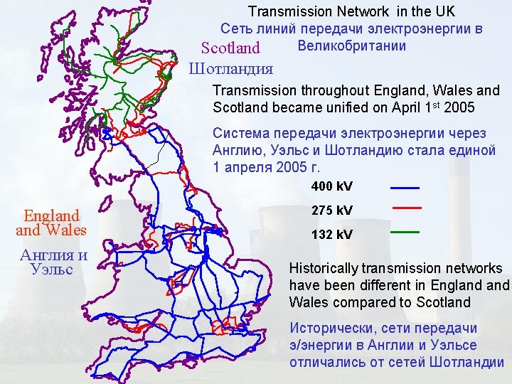 Changes in Structure of Supplies Companies in last 4 years Изменения в структуре компаний-поставщиков за последние 4 года Electricité de France (EDF) acquire London and SEEBOARD Электричество Франции (ЭФ) снабжает Лондон и Сиборд n. Power acquires Yorkshire n. Power снабжает Йоркшир Power. Gen acquires Eastern (TXU) EDF acquire SWEB Power. Gen снабжает Восточный (TXU), EDF снабжает SWEB Scottish and Southern acquire SWALEC Scottish and Southern снабжают SWALEC n. Power acquire Northern Power. Gen acquire NORWEB n. Power снабжает Северный Power. Gen снабжает NORWEB Only in Scotland has their been no change in ownership Только в Шотландии не было изменений в отношении прав собственности