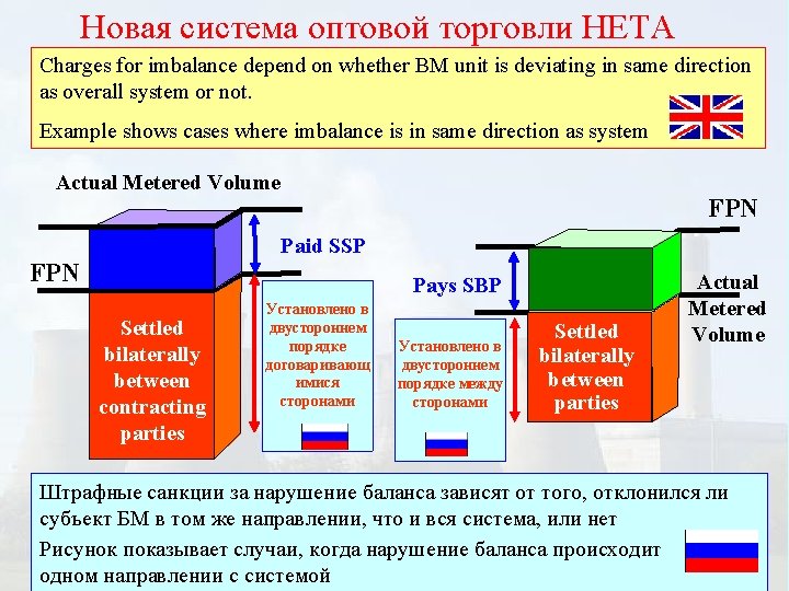 The New Electricity Trading Arrangements Новая система оптовой торговли НЕТА The Balancing Mechanism • • Балансирующий механизм To allow system to remain stable Too little electricity on the system – Generators can OFFER to INCREASE output – Suppliers can OFFER to REDUCE consumption Time OFFER FPN Time • If OFFER is agreed then Generators / Suppliers are PAID for any electricity increased / reduced under the OFFER.