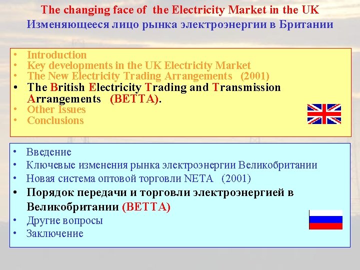 The changing face of the Electricity Market in the UK Изменяющееся лицо рынка электроэнергии в Британии • • A brief review of the UK Electricity Industry prior to 1990. The Electricity Markets in the 1990 s after Privatisation The New Electricity Trading Arrangements NETA (2001) The British Electricity Trading and Transmission Arrangements (BETTA). • The Supply of Electricity since 1990 • Conclusions • Краткий обзор состояния британской электроэнергетики перед приватизацией в 1990 г • Рынки электроэнергии в 1990 г после приватизации • Новая система оптовой торговли NЕТА (2001) • Порядок передачи и торговли электроэнергией в Великобритании (BETTA) • Сбыт электроэнергии с 1990 • Заключение