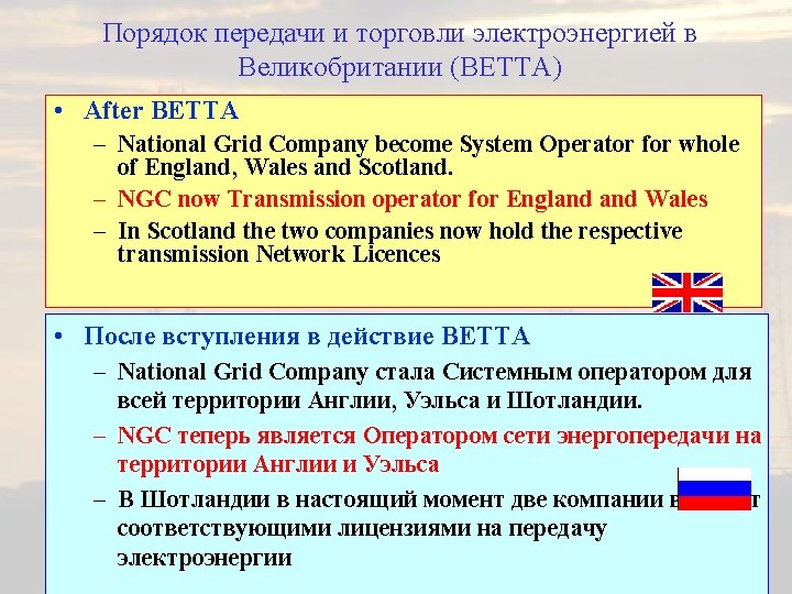 Developments in the Electricity Markets in the UK: the move towards BETTA Развитие рынка электроэнергии в Великобритании: на пути к ВЕТТА This presentation is available over Internet at • www 2. env. uea. ac. uk/gmmc/neta/NETA. htm • Further information on the POOL and NETA – The Changing Face of the Electricity markets in the UK [2003] – Recent Changes in the Electricity Markets in the UK [2004] – Available at the same WEB address Настоящая Презентация доступна в сети Internet по адресу • www 2. env. uea. ac. uk/gmmc/neta/NETA. htm • Дополнительная информация по POOL и NETA – Изменяющийся облик рынка электроэнергии в Великобритании [2003] – Последние изменения рынка электроэнергии Великобритании[2004] – Доступны по указанному выше WEB-адресу