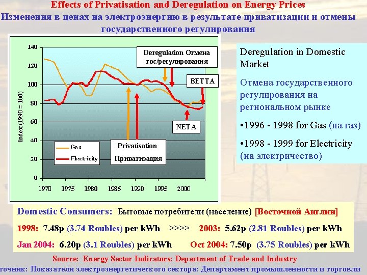 The Supply of Electricity since 1990 Сбыт электроэнергии с 1990 Domestic Consumers: Бытовые потребители (население) Transition Arrangements to 1998 Договоры о переходном периоде на период до 1998 Domestic Consumers did not benefit from competition until September 1998. Prices to Domestic Consumers were regulated according to the formula: RPI - X + E + F RPI is a measure of inflation X was a factor set by Regulator - initially ~ 5% but later reduced. E was an energy conservation factor whereby costs of such measures could be passed on to the consumer F was a levy designed to promote exploitation of Renewables