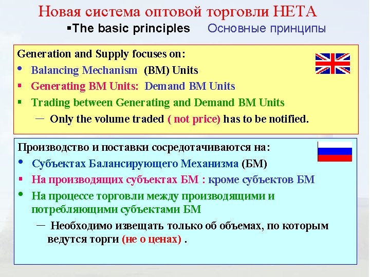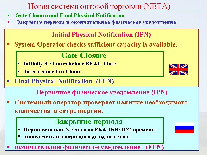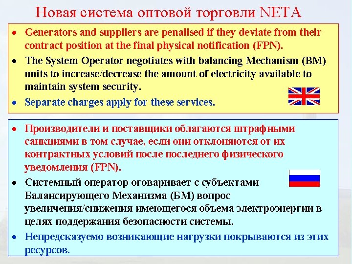 The New Electricity Trading Arrangements Новая система оптовой торговли НЕТА The Balancing Mechanism • • Балансирующий механизм To allow system to remain stable Too little electricity on the system – Generators can OFFER to INCREASE output – Suppliers can OFFER to REDUCE consumption Time OFFER FPN Time • If OFFER is agreed then Generators / Suppliers are PAID for any electricity increased / reduced under the OFFER.