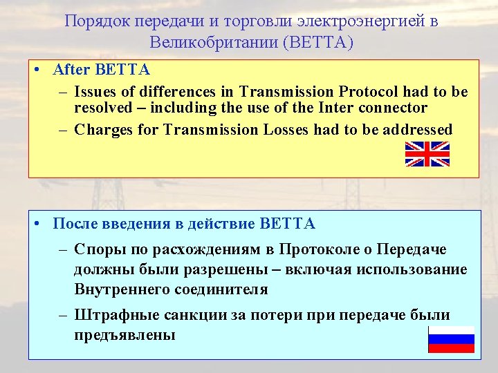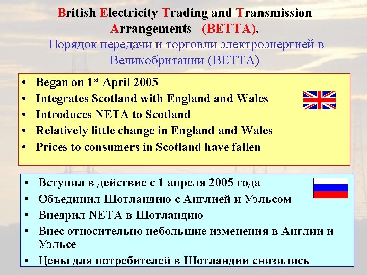 Developments in the Electricity Markets in the UK: the move towards BETTA Развитие рынка электроэнергии в Великобритании: на пути к ВЕТТА This presentation is available over Internet at • www 2. env. uea. ac. uk/gmmc/neta/NETA. htm • Further information on the POOL and NETA – The Changing Face of the Electricity markets in the UK [2003] – Recent Changes in the Electricity Markets in the UK [2004] – Available at the same WEB address Настоящая Презентация доступна в сети Internet по адресу • www 2. env. uea. ac. uk/gmmc/neta/NETA. htm • Дополнительная информация по POOL и NETA – Изменяющийся облик рынка электроэнергии в Великобритании [2003] – Последние изменения рынка электроэнергии Великобритании[2004] – Доступны по указанному выше WEB-адресу