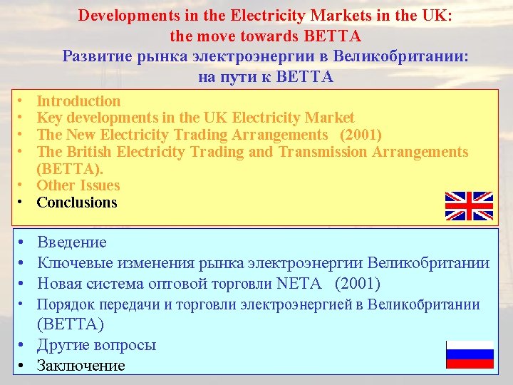 The changing face of the Electricity Market in the UK Изменяющееся лицо рынка электроэнергии в Британии • • A brief review of the UK Electricity Industry prior to 1990. The Electricity Markets in the 1990 s after Privatisation The New Electricity Trading Arrangements NETA (2001) The British Electricity Trading and Transmission Arrangements (BETTA). • The Supply of Electricity since 1990 • Conclusions • Краткий обзор состояния британской электроэнергетики перед приватизацией в 1990 г • Рынки электроэнергии в 1990 г после приватизации • Новая система оптовой торговли NЕТА (2001) • Порядок передачи и торговли электроэнергией в Великобритании (BETTA) • Сбыт электроэнергии с 1990 • Заключение
