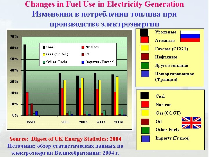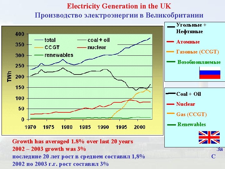 Changes in Structure of Supplies Companies in last 4 years Изменения в структуре компаний-поставщиков за последние 4 года Electricité de France (EDF) acquire London and SEEBOARD Электричество Франции (ЭФ) снабжает Лондон и Сиборд n. Power acquires Yorkshire n. Power снабжает Йоркшир Power. Gen acquires Eastern (TXU) EDF acquire SWEB Power. Gen снабжает Восточный (TXU), EDF снабжает SWEB Scottish and Southern acquire SWALEC Scottish and Southern снабжают SWALEC n. Power acquire Northern Power. Gen acquire NORWEB n. Power снабжает Северный Power. Gen снабжает NORWEB Only in Scotland has their been no change in ownership Только в Шотландии не было изменений в отношении прав собственности