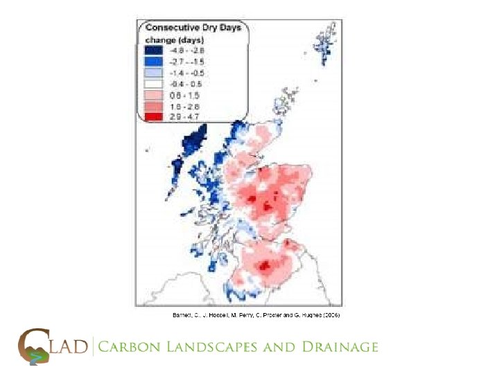 Hydroclimatic variability changing • Wetter winters forecast – Increased likelihood of saturation • Summer droughts periods predicted - drop in summer water tables likely and possibility of associated vegetation community change • Autumnal runoff roughly the same • Likely to exacerbate flood and DOC potential?