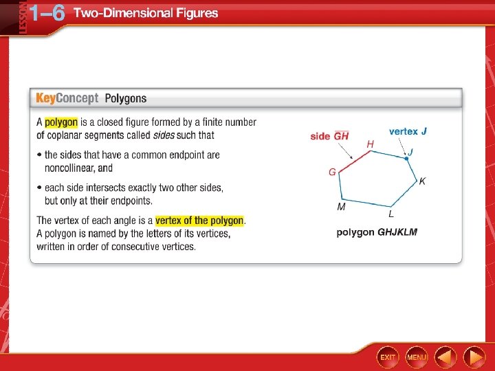 Polygons are generally classified by its number of sides. The table below lists some common names for various categories of polygons. A polygon with n sides is an n-gon. KNO W TH Number of Sides 3 4 5 6 7 8 9 10 11 12 N Polygon Triangle Quadrilateral Pentagon Hexagon Heptagon Octagon Nonagon Decagon Hendecagon Dodecagon n-gon ESE PREFIXE S