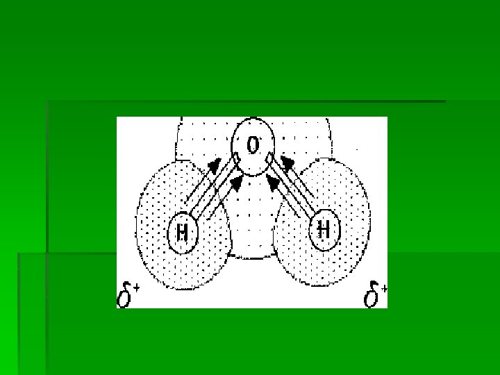 Polar Covalent Bonds § Polar bond -- Covalent bond formed by an unequal sharing of electrons between atoms. § • Occurs when the atoms involved have different electronegativities. § • In water, electrons spend more time around the oxygen than the hydrogens. This causes the oxygen atom to have a slight negative charge and the hydrogens to have a slight positive charge.