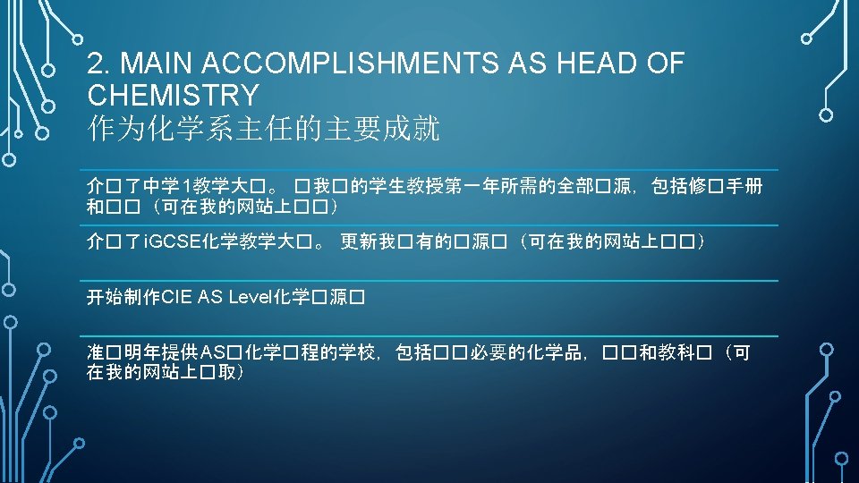 2. MAIN ACCOMPLISHMENTS AS HEAD OF CHEMISTRY Introduced the Secondary 1 syllabus. Made all of the resources necessary to teach the first year to our students, including revision booklets and tests (accessible on my website) Introduced the i. GCSE Chemistry syllabus. Updated my existing library of resources (accessible on my website) Started to make the CIE AS Level Chemistry library of resources Prepared the school for delivery of the AS level chemistry course next year, including ordering necessary chemicals, equipment and textbooks (accessible on my website)