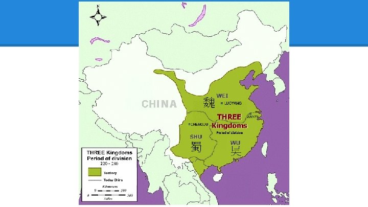 THE PERIOD OF DISUNITY (220 -581) After the fall of the Later Han, the Chinese Empire remained divided for three and a half centuries. Three Kingdoms: Wei, Shu Han and Wu Tribal invaders from the north soon overran the kingdoms Four dynasties established by the Chinese ruled in the south during the 4 th and 5 th centuries