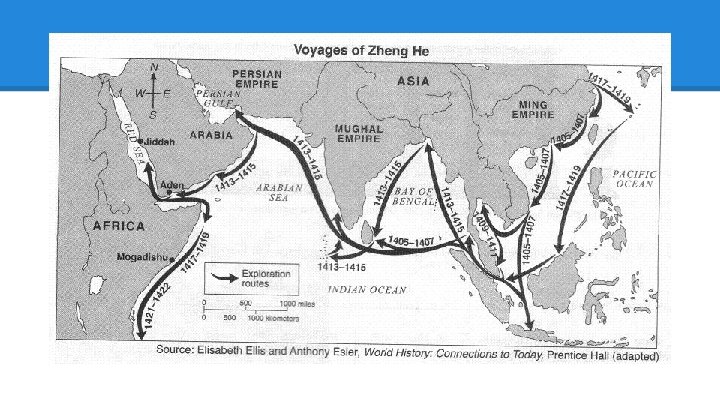 Zheng He China was very interested in exploration - 1405: Zheng He led a fleet of 62 large ships and over 25 k crew - goals of the expeditions were to promote trade and collect tribute - 1405 - 1433: explored the coasts of Southwest Asia, Persian Gulf, and East Africa