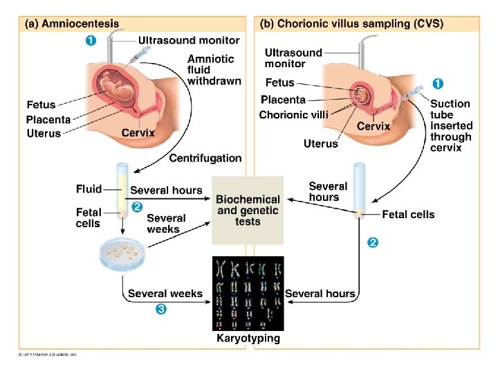 Prenatal Testing • May be used on a fetus to detect genetic disorders • Amniocentesis: remove amniotic fluid around fetus to culture for karyotype • Chorionic villus sampling: insert narrow tube in cervix to extract sample of placenta with fetal cells for karyotype