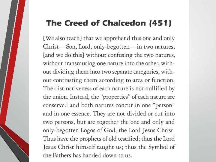 The Council of Chalcedon - 451 • Also very heated and divisive • Remnants of Nestorianism and Eutychianism dismissed • Issuance of the Confession of Chalcedon
