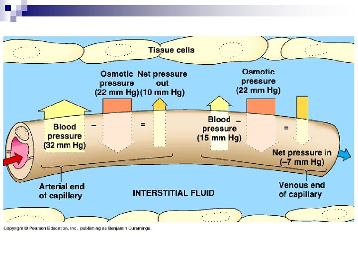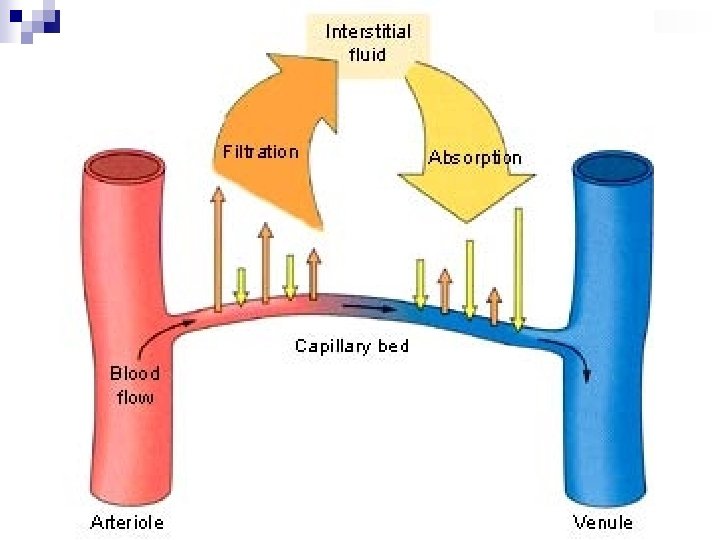Capillary Exchange n n n Filtration: The movement of materials from capillaries into the interstitial fluid, . Reabsorption: The movement of materials from the interstitial fluid into the capillaries. Edema: The increase in interstitial fluid volume caused by filtration rate exceeding reabsorption rate which results in bloated tissue! Can be caused… ¨ Increased capillary blood pressure ¨ Increased permeability of the capillaries ¨ Decreased concentrations of the plasma proteins