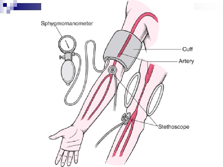 Blood Pressure n n Blood Pressure: The measure of pressure inside the main arteries during systole and diastole. Pulse Pressure: The difference between systolic & diastolic pressure. ¨ Can be used to measure the stress on the arteries caused by the contractions of the heart. n Mean Arterial Pressure (MAP): The average blood pressure in the arteries. ¨ Measured pressure. as the 1/3 point between diastolic & systolic