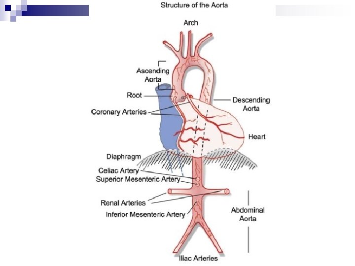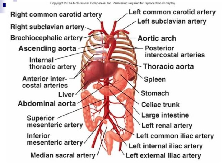 The Systemic Arteries n Ascending Aorta: The biggest blood vessel starting out the systemic circuit – leaves the left ventricle of the heart & extends to the arch of the aorta. ¨ Right & Left Coronary Arteries: First branches of the ascending aorta that supply the heart muscle with blood.
