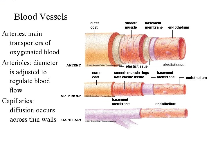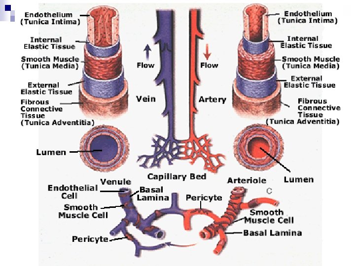 Blood Vessel Anatomy n Tunics: The three layers that make up the walls of arteries & veins ¨ Tunica Adventitia: Outer layer composed of loose connective tissue – keeps the vessels in place. n ¨ Tunica Media: Middle layer composed of smooth muscles. n n ¨ n Vasa Vasorum: Supplies nutrients to the larger arteries & veins. Vasoconstriction: Contraction of this layer that narrows the blood vessel. Vasodilation: Relaxation of this layer that widens the blood vessel. Tunica Interna: Inner layer composed of smooth endothelium – allows blood to pass through easily without catching on the walls. Lumen: The hollow center of the blood vessel through which blood flows.