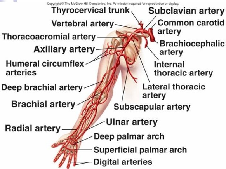 The Systemic Arteries n Upper Limb Arteries: ¨ Subclavian: The artery that serves the upper limbs. ¨ Subclavian axillary brachial radial & ulnar palmer arches palmer digitals & metacarpal.