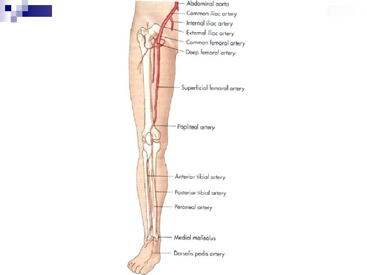 The Systemic Arteries n Lower Limb Arteries: All begin with the Common Iliac Arteries, which divide into the internal & external common iliac. ¨ External iliac femoral popliteal anterior & posterior tibial fibular dorsal & plantar of the foot metatarsal & digital